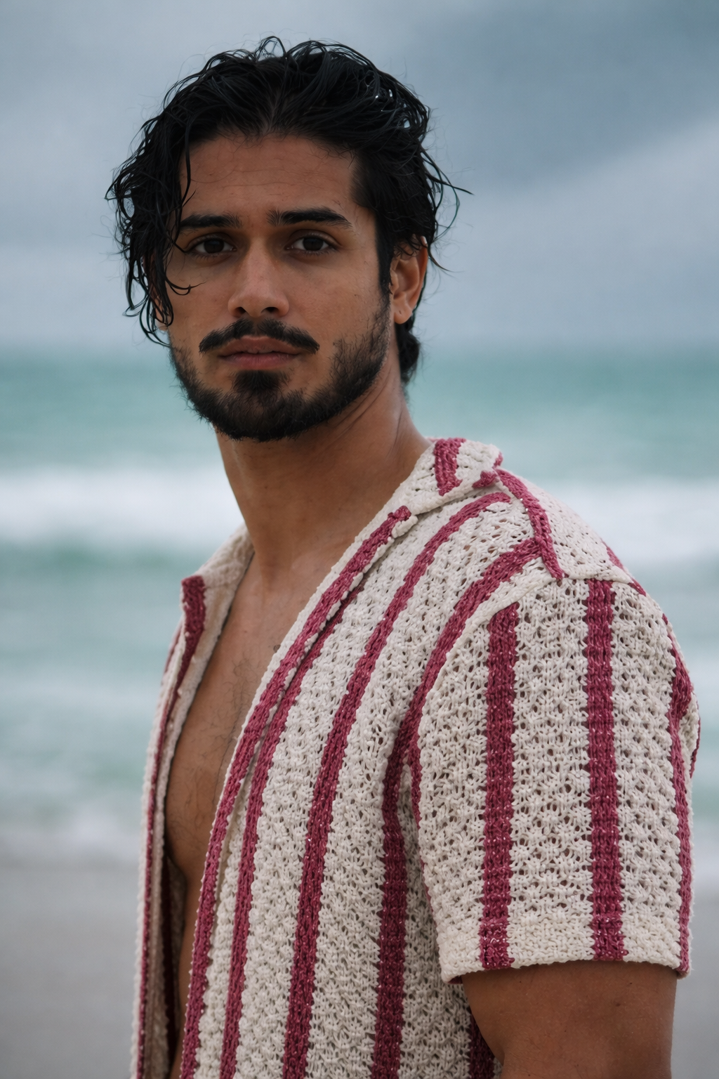 Oliver Kennedy appears polished, wealthy heir with mysterious undertones. His cream crochet shirt features subtle red vertical lines. The outfit balances laid-back comfort with high-end appeal. Airy knit texture adds depth and breathability. Cuban collar creates effortless resort-luxury aesthetic. Coordinating shorts emphasize his elite background and carefree attitude. Relaxed styling contrasts with heavier secrets he carries. This contrast reinforces duality between privilege and hidden past. His confident exterior masks deeper mystery beneath.