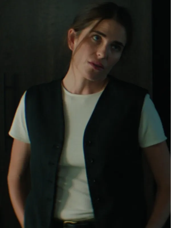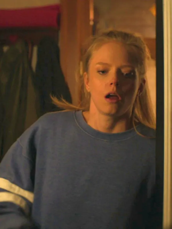 In the 2026 Prime Video series 56 Days, Jane Miller wears a sleek athleisure jacket. The jacket emphasizes style and performance simultaneously. Contoured seams sculpt her body for a perfect fit. The mock-neck collar enhances comfort and adds subtle elegance. A full-length zipper enables easy wear and movement. Thumbhole cuffs secure sleeves while allowing free motion. Hidden zippered pockets store essentials discreetly and safely. Matte, high-stretch technical fabric ensures durability and modern sophistication.