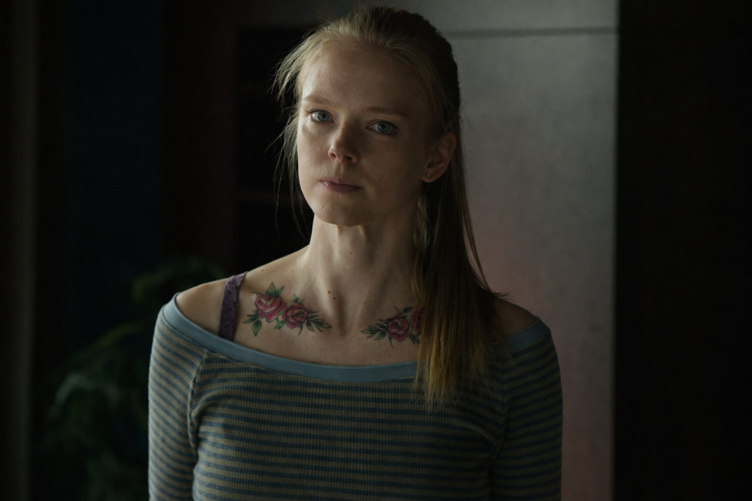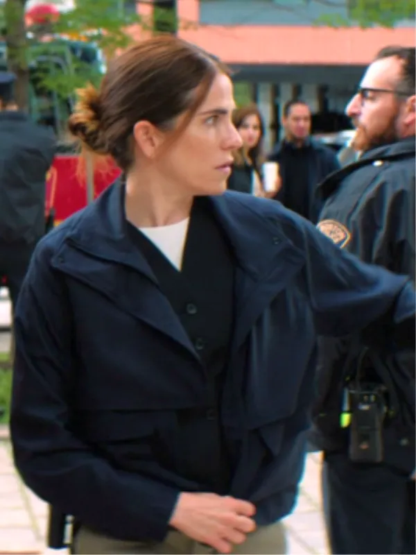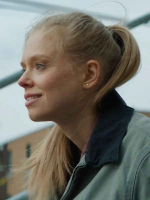 Megan Peta Hill portrays Shyla with grounded authenticity. She wears a sage green Detroit-style jacket with cropped silhouette. The jacket features a boxy cut and structured seams. A dark corduroy collar accents the jacket’s practical design. Functional zip pockets add utility to Shyla’s outfit. The structured seams emphasize her no-nonsense, practical nature. Subdued colors reinforce her grounded, serious personality. The overall design keeps her look modern and stylish.