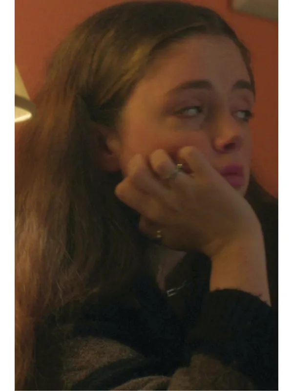 Dove Cameron wears a striking emerald wrap coat as Ciara Wyse. The rich green hue radiates self-assurance and subtle intrigue. Designers crafted it like a luxurious bathrobe with broad lapels. A tie belt cinches the waist while maintaining effortless elegance. The coat’s midi length adds timeless sophistication to her look. Soft wool-cashmere blend enhances comfort and luxurious appeal. This coat reflects Ciara’s polished exterior and hidden edgy nature.