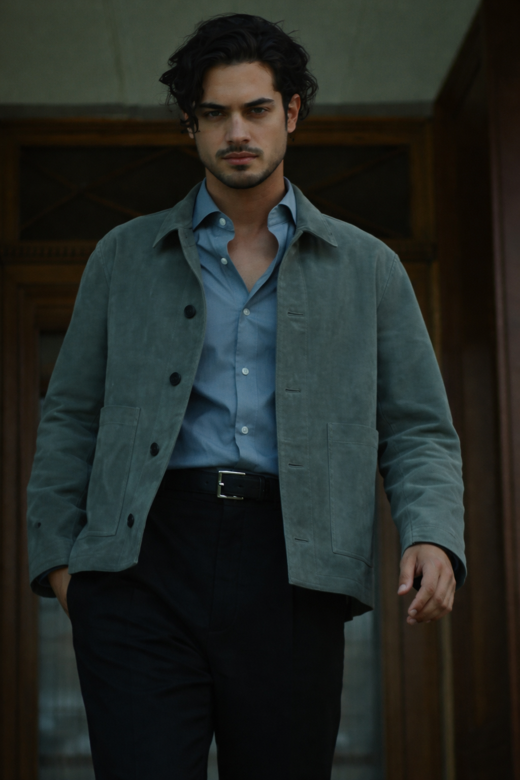 Oliver chose a desaturated sage green jacket palette. He blended subtle earthy undertones into the jacket’s color. He worked with mid-weight suede leather from goats. He considered calf leather as an alternative material option. He designed a straight-cut, boxy silhouette extending below waist. He added a spread collar for classic elegance touch. He secured the full-front closure with dark horn buttons. He incorporated resin buttons for quiet, rugged charm. He placed two large patch pockets on the hips. He left the cuffs simple and open for movement. He created a jacket exuding rugged sophistication and masculinity.