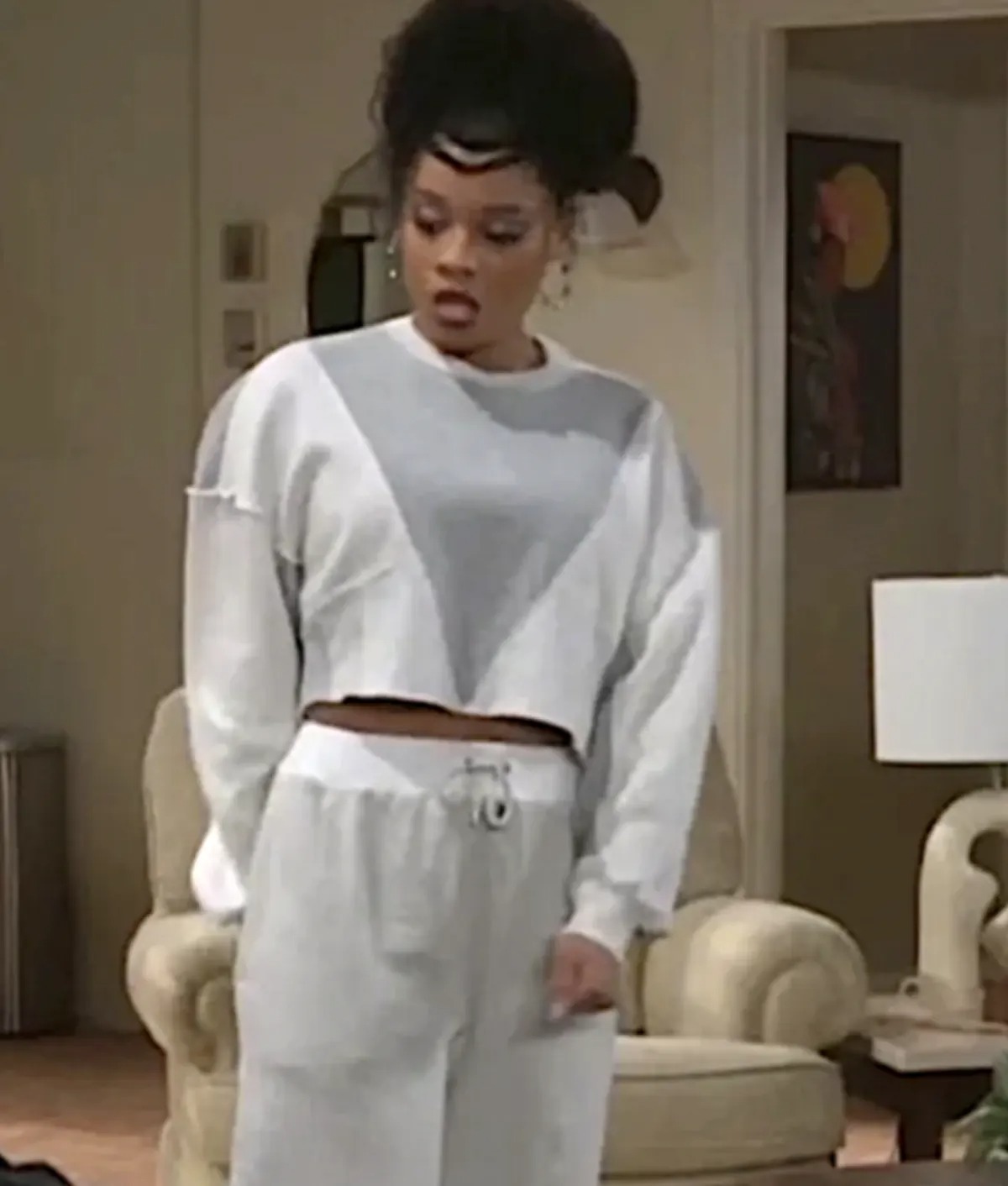 Echoing Andra Day’s 2021 SNL grey sweatshirt, Eva Thomas designs a retro-modern blend. Furthermore, the sweatshirt balances bold structure with refined and precise detailing throughout its design. Its clean lines and cropped shape create a tailored fit that enhances overall style. Consequently, you can pair it with high-waisted joggers or tailored sweatpants effortlessly. Thus, it forms a coordinated and fashionable street-style set for modern wearers.
