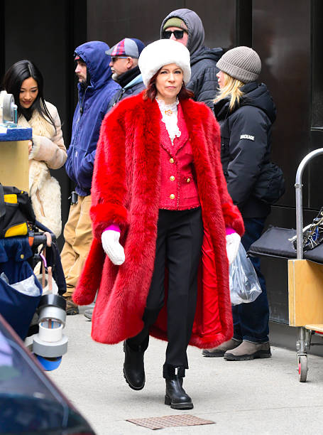 The coat flaunts a saturated Cherry Red, candy-apple finish. This brilliant hue commands attention against neutral urban backdrops. Carrie paired the coat with a stark white fur hat. She combined it with a ruffled blouse for style. The ensemble creates a "Santa-chic" and "Russian Royal" palette. It delivers a festive yet regal visual effect.