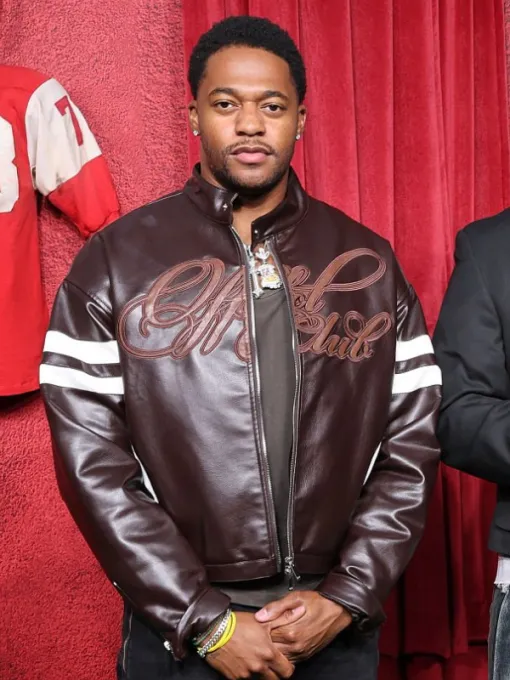 Christopher Meyer Universal Pictures “Him” Premiere White Striped Brown Zipper Bomber Leather Jacket with A Dark Chocolate Statement