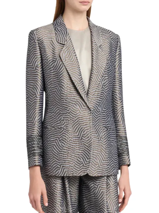 The grey blazer uses woven jacquard construction for dimensional texture. Additionally, it showcases sophisticated zebra-inspired chevron patterning. Designers embed pattern into fabric instead of printing it. It creates light-responsive surface with shifting visual depth. The palette merges slate grey and steel blue tones. Furthermore, it adds champagne gold and silver metallic highlights. It produces luminous shifting effect under changing lighting conditions. It pairs well with pleated blouse in bronze tones. Additionally, stylists use ochre hues, gold accessories, leather watch. It creates refined professional contrast in color palette.