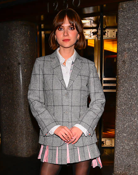 Emilia Jones paired the gray blazer with a crisp white shirt underneath. The white shirt creates striking contrast against the darker gray pattern. This combination highlights the blazer’s grid design and adds freshness. Her styling shows the blazer can be professional yet effortlessly chic. Paired with trousers or jeans, it proves a versatile fashion essential.