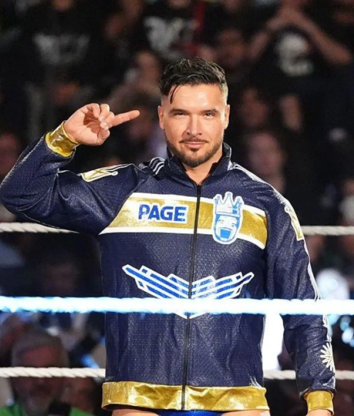 Additionally, personalized details bring jacket to life, featuring bold blue “PAGE” branding and crowned mascot graphic. Furthermore, beneath it, a futuristic cyan and white geometric crest adds visual intensity and modern flair. Moreover, sporty white piping runs along shoulders and sleeves, reinforcing its athletic identity. In addition, sleeves feature contrasting graphic elements, including a striking sun-inspired emblem adding personality and edge. Finally, you can shop the Ethan Page navy track jacket featured on Monday Night RAW from The Celeb Jackets. It offers premium celebrity-inspired fashion with real-world wearability.