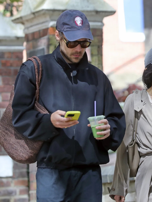 What makes their look stand out is coordinated styling rather than identical outfits. Moreover, Harry Styles and Zoë Kravitz both incorporated navy caps, sunglasses, and shoulder-slung bags. Consequently, they subtly aligned aesthetics while still preserving their individual personal style identity. Additionally, accessories like aviator sunglasses and leather totes reinforce a synchronized yet effortless fashion language. Shop the Harry Styles navy harrington jacket and Zoë Kravitz's khaki-gray trench coat exclusively from The Celeb Jackets. Where celebrity-inspired outerwear is recreated with premium craftsmanship and modern detailing.