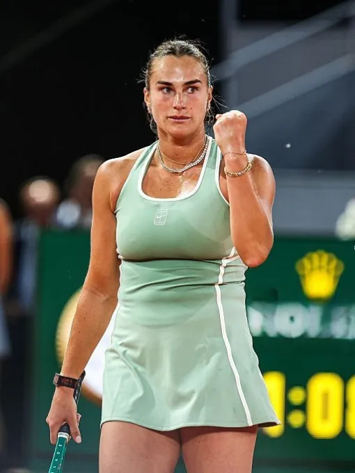 Dri-FIT technology keeps her cool during intense matches on the clay. Additionally, she pairs her athletic gear with elegant layered gold jewelry. This ensemble combines high-performance functionality with modern fashion trends. The vibrant green color contrasts beautifully against the bright red court, just like her pink, orange and black dress. She completes the look with a sleek, professional high bun. Sabalenka consistently proves why she belongs at the top of the sport. Her outfit reflects a perfect balance of fierce strength and refined grace. Fans admire how her wardrobe choices match her aggressive playing style. Every detail on this garment supports her movement during high-stakes points. The white piping highlights her athletic frame as she strikes the ball.