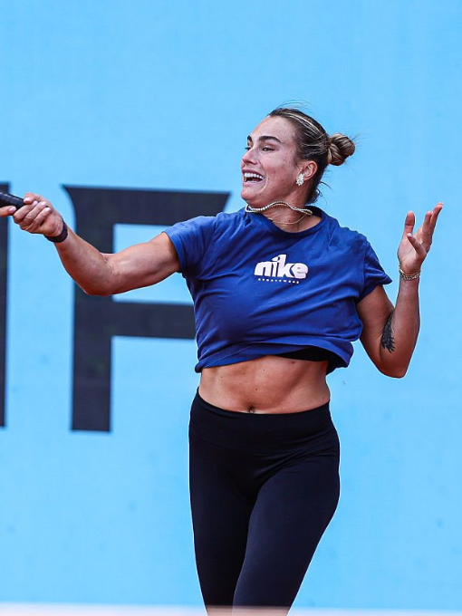 This look solves common problem athletes face: restrictive, poorly ventilated training wear. Moreover, Aryna Sabalenka designs outfit for maximum breathability and flexibility during intense matches. She wears a royal blue short-sleeved tee with classic crew neckline. Additionally, it features bold white Nike logo across the chest. She styles it cropped and tucked, improving airflow and revealing a black sports bra underneath. This provides added support and comfort throughout performance.