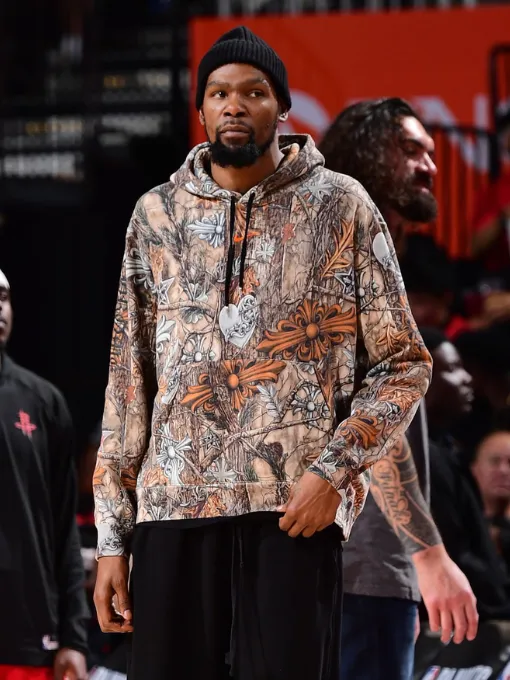 Kevin Durant made strong visual statement in Round One Game Four of 2026 NBA Playoffs. He played at Toyota Center in Houston, Texas, elevating his courtside presence on April 26th, 2026. His outfit blended performance energy with high-impact streetwear for standout courtside appeal. Moreover, he wore a tan and brown camouflage hoodie with RealTree woodland base. Bold Chrome Hearts floral and cross graphics in orange and silver created layered design.