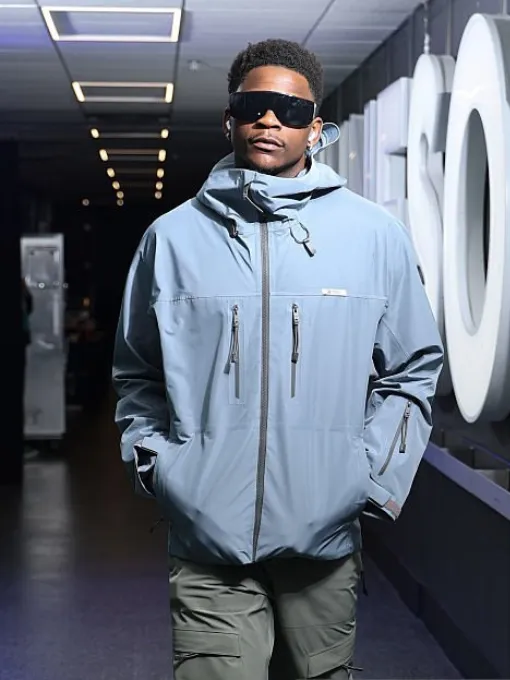 Looking for a modern streetwear piece that blends function with bold attitude? The Anthony Edwards Denver Nuggets Vs Minnesota Timberwolves jacket delivers standout appeal effortlessly. It captures movement, confidence, and a sporty edge inspired by Anthony Edwards. Moreover, the design reflects casual fashion seen in professional or stadium environments. The image shows a man walking through a corridor with relaxed confidence. He wears a light blue hooded jacket paired with dark green cargo pants. Additionally, large dark sunglasses elevate the overall look with a sleek finish. The background features large white letters, partially hidden by perspective. Therefore, the setting feels like a stadium or a professional building space. This combination creates a strong, modern streetwear aesthetic.
