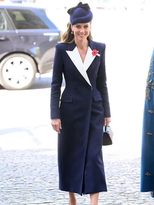 Catherine elevated the ensemble with a matching navy felt pillbox hat featuring sculptural bow. Additionally, she paired it with tonal navy suede pointed-toe pumps. A bright red poppy pin on the lapel added symbolic meaning and striking contrast. The look was completed with sapphire and diamond jewelry perfectly complementing royal blue tones. Moreover, you can shop Catherine Princess of Wales navy long coat from The Celeb Jackets. Where timeless royal-inspired fashion meets modern craftsmanship for elegant everyday and formal styling.