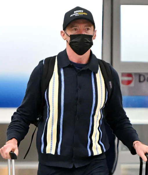 Hugh Jackman embodies Wolverine in X-Men and extends similar strength into off-screen style. Additionally, he starred in Les Misérables and The Greatest Showman, earning a Tony Award on Broadway. Moreover, he works as a producer and philanthropist with global influence. At the airport, he wears a navy blue long-sleeved button-up shirt featuring bold vertical knit paneling. Four stripes include two cream panels bordered by thin light blue accents, creating mid-century bowling inspiration. Meanwhile, he pairs the shirt with matching navy blue straight-leg trousers, forming a clean tonal silhouette. Consequently, smooth fabric enhances a streamlined effect, ideal for long-haul travel. Additionally, a black baseball cap with yellow and white embroidered text adds a casual edge. Meanwhile, a black disposable face mask ensures practicality, while he carries a black backpack and hardshell suitcase.