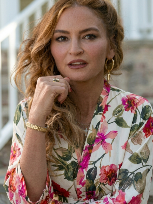 Next, the silhouette follows a classic wrap style with a flattering V-neckline. Furthermore, long, wide sleeves create a breezy fit for comfort and movement. Thus, you can wear it while lounging or stepping out in effortless style, as same as Cobie Smulders' denim shirt. Similarly, the adjustable waist tie lets you define shape or keep a relaxed look. Importantly, designers place the print thoughtfully across shoulders and hem. Therefore, the florals appear naturally balanced, enhancing a boutique, high-end finish.