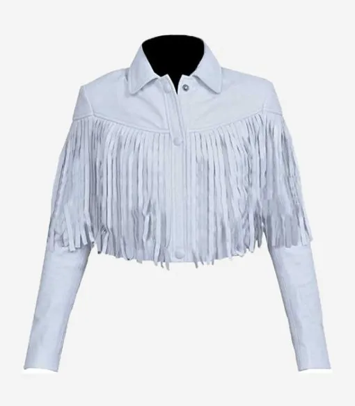 The jacket uses pure white leather, offering luxurious feel and contemporary style. In addition, it modernizes traditional brown and tan suede fringe jackets with freshness. Its crisp, clean tone enhances all other elements, making the fringe visually striking.Long fringe extends from a V-shaped yoke across the chest and down the arms. Consequently, every gesture creates movement and drama, adding energy to the outfit. Designers use the fringe to evoke dynamic Western flair while maintaining modern elegance.The V-shaped stitching reflects Western Americana heritage while remaining minimalist and contemporary. Furthermore, it frames the chest and shoulders, creating flattering structure and visual interest. Slim, tapered sleeves contrast the flowing fringe, balancing sophistication with playful movement. Thus, the jacket achieves harmony between structure and dramatic detailing.