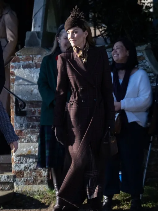 On December 25, 2025, Kate Middleton attended the Christmas morning service at Sandringham wearing a brown plaid wool coat. The coat features a traditional double-breasted front, notch lapel collar, and long sleeves with open hem cuffs, giving a structured yet approachable silhouette. Crafted from premium wool and lined with viscose, the coat provides warmth and comfort during outdoor winter events. The plaid pattern, incorporating subtle browns and burgundy shades, adds seasonal charm. Functional curved waist pockets enhance practicality while maintaining style. Its full-length design creates an elegant line suitable for ceremonial appearances. This coat exemplifies Kate’s ability to combine classic British tailoring with festive seasonal details, allowing her to appear polished, warm, and stylish during family and public engagements.