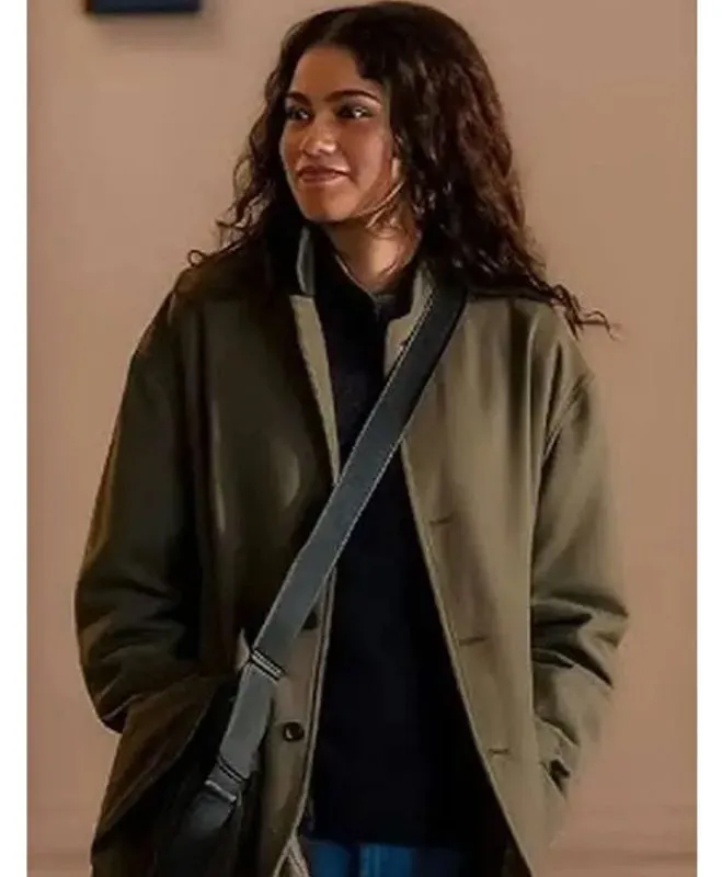 This olive green jacket brings a workwear-inspired aesthetic into the film with a grounded, utilitarian feel. Moreover, the color sits within the army green and khaki spectrum, enhancing its rugged visual appeal. Designers construct the jacket from heavyweight cotton twill or canvas-like fabric for a structured look. As a result, the material creates a slightly rugged appearance while maintaining durability and form. The design follows a chore coat or field jacket style with a straight, boxy silhouette. Therefore, it allows a relaxed fit that supports easy movement and everyday comfort. Instead of traditional lapels, the jacket features a clean stand collar for a modern edge. Additionally, large dark buttons in black or deep brown create subtle contrast on the front. At the same time, functional welt pockets at the hips offer both practicality and warmth. The set-in shoulder construction ensures the jacket holds its shape despite its roomy structure. Furthermore, stylists pair it over a dark high-neck layer to enhance layering versatility. Often, they complete the look with accessories like a crossbody bag for a refined finish.