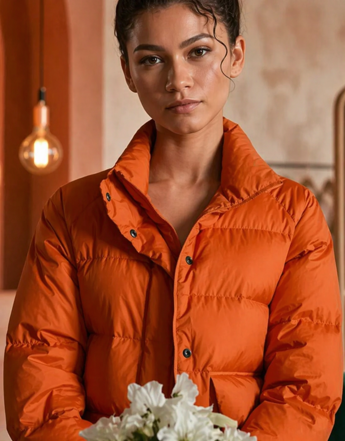 The burnt orange puffer jacket instantly grabs attention with its rich pumpkin-rust color tone. Moreover, designers use a matte-to-satin nylon or polyester shell to ensure durability and performance. Additionally, wide horizontal quilting forms thick insulated sections, creating a bold and voluminous silhouette. Meanwhile, the high stand-up collar adds extra protection against harsh cold weather conditions. Furthermore, the front features a zipper hidden beneath a storm flap secured with snap buttons. At the same time, raglan-style sleeves allow smoother layering and improve overall mobility. In addition, insulated top-loading flap pockets at the waist enhance both warmth and everyday functionality. Overall, the jacket delivers a puffy, slightly boxy fit that defines modern streetwear winter fashion.