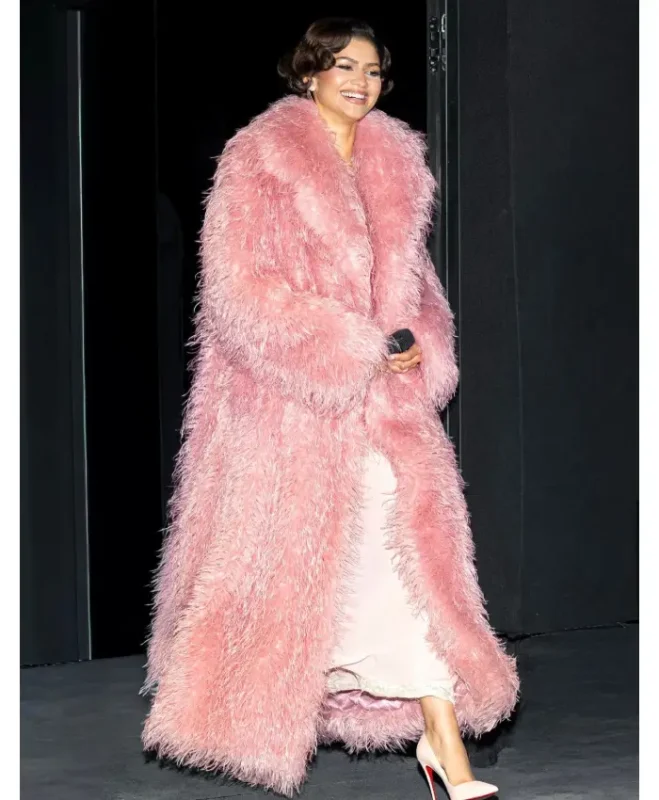 At the Paris premiere, Zendaya wore a dusty rose pink fur coat by Ermanno Scervino. Moreover, the coat showcases a shaggy faux fur texture that adds volume, movement, and depth. Its floor-length design enhances a dramatic silhouette and creates a strong visual impact overall. In addition, oversized notched lapels frame the neckline and highlight its couture-inspired structure. The elongated sleeves partially cover her hands, reinforcing an elegant haute couture aesthetic. Furthermore, hidden fastenings maintain a clean look and keep focus on rich texture. She styled the coat over a delicate lace chiffon dress for contrast. As a result, the look blends soft femininity with bold, dramatic outerwear styling.
