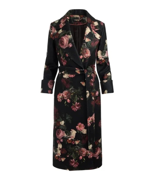The coat adopts a wrap-style design with a structured shoulder silhouette. Moreover, the self-tie waist belt shapes the body into an elegant hourglass. The notched lapel adds sophistication and echoes premium outerwear trends. Instead of small motifs, the bold roses create a dramatic, painterly effect. Additionally, the dark background enhances floral hues without overwhelming the eyes. The coat falls between midi and maxi, extending elegantly below the knee. Its material combines durability with refinement, likely heavyweight wool or jacquard fabric. Furthermore, the fabric drapes smoothly while holding a structured, flattering shape.