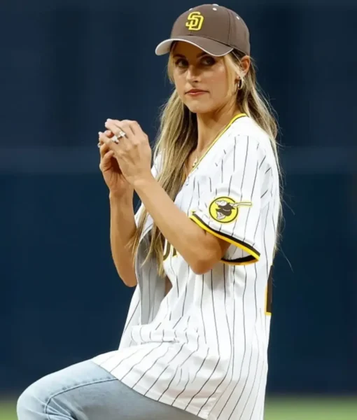 The jersey blends MLB tradition with contemporary fan style. Additionally, it draws inspiration from Kendall Long's ceremonial first pitch at Petco Park. Moreover, it reflects the Padres and Giants rivalry with a clean fashion-forward look. Just Like Sophie Cunningham Outfits. It suits both stadium wear and casual street styling.