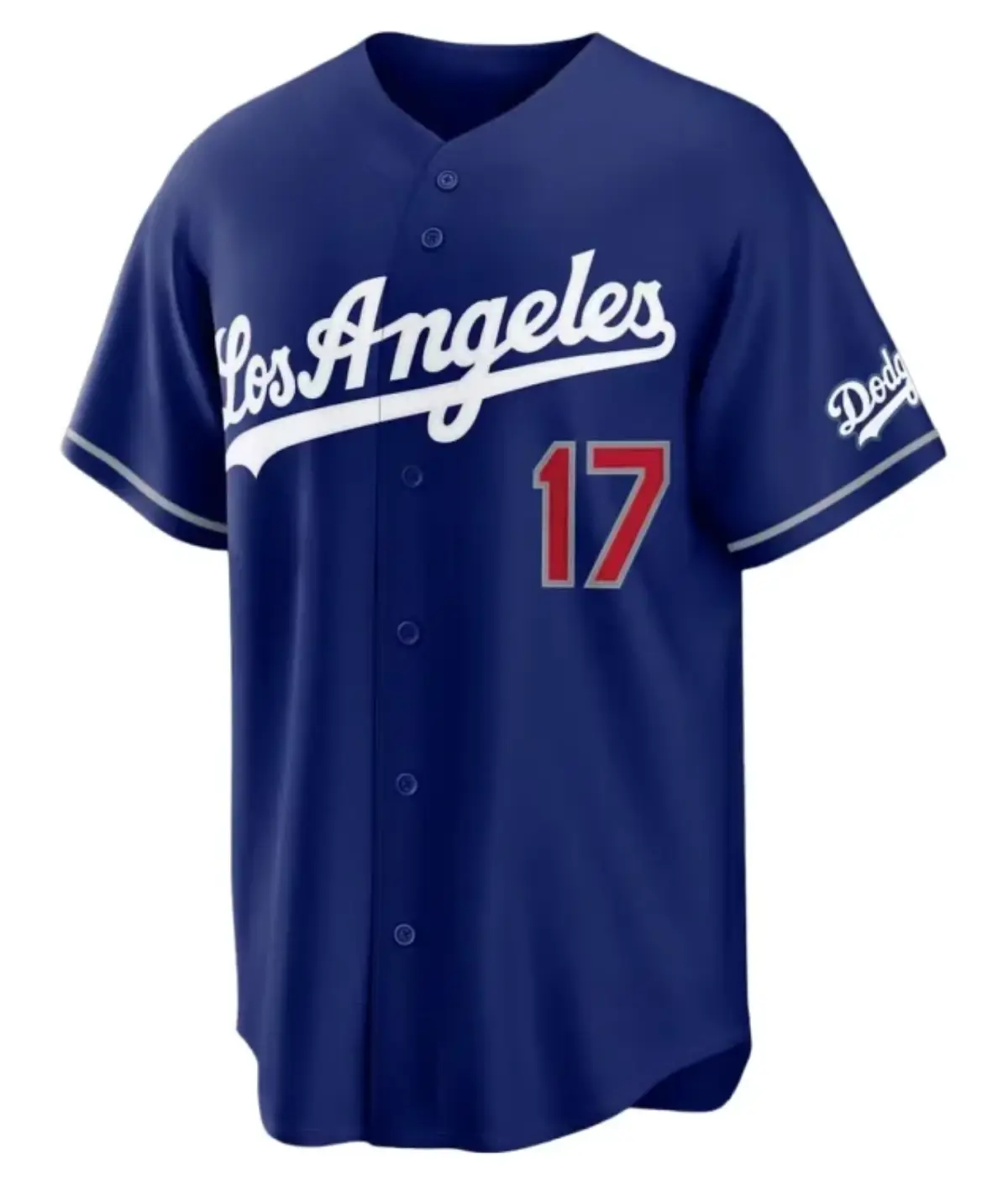 This jersey uses breathable, high-quality fabric to deliver lasting comfort, durability, and a smooth matte finish. Furthermore, the deep royal blue base commands attention with a bold, classic edge. Across the chest, “Los Angeles” pops in crisp white script with a dynamic upward slant. As a result, it channels the timeless Dodgers vibe finished with a modern flair inspired by Cooper Flagg’s Dallas style. Additionally, a traditional swoosh-style flourish underlines the lettering and adds a subtle retro-inspired touch. Just below, the design showcases Ohtani’s number 17 in vibrant red. Consequently, a clean grey or white outline ensures strong visual contrast.