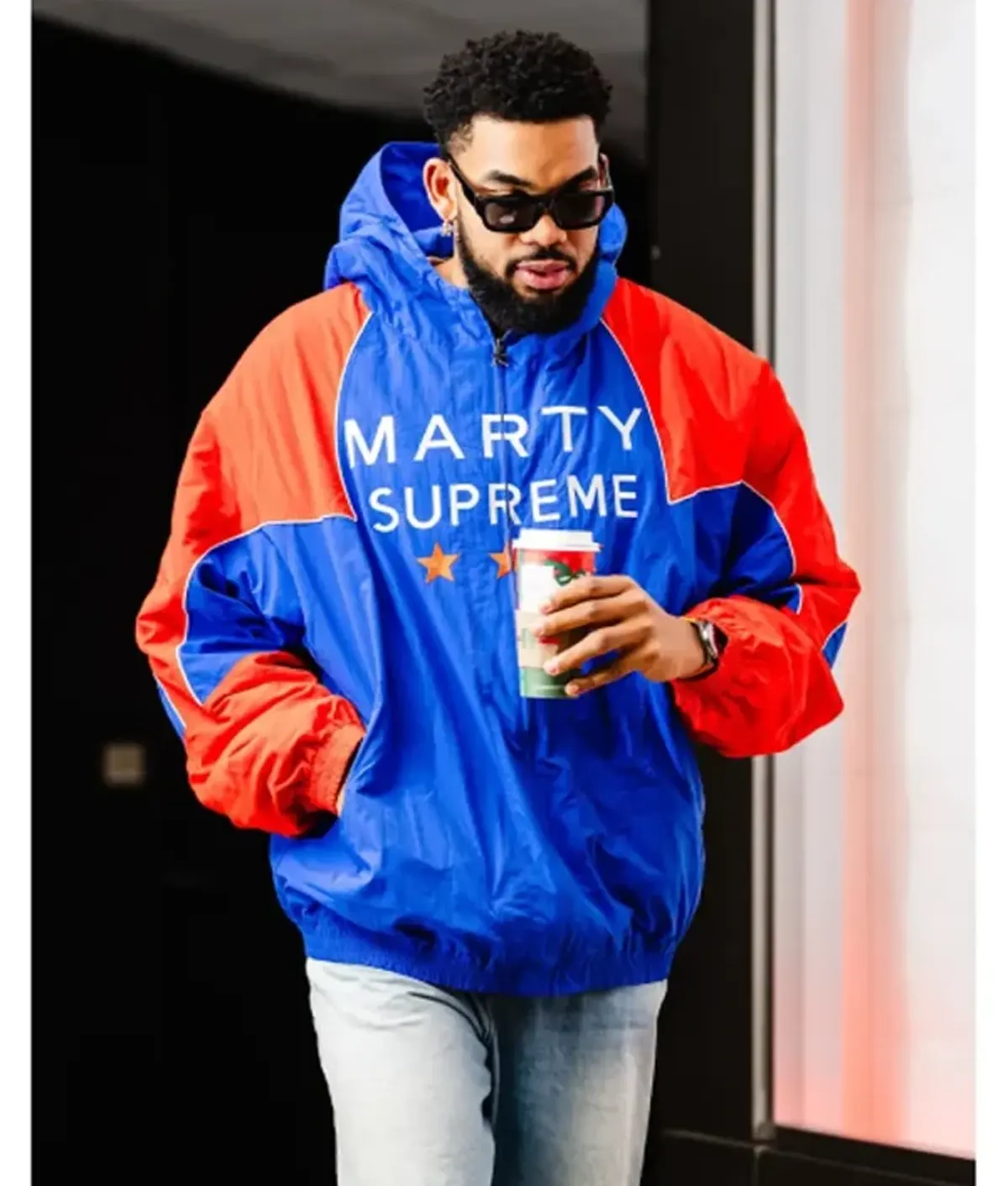 To begin with, the blue & orange jacket showcases a vibrant and dynamic design. Specifically, it combines royal blue, bright red, and crisp white colors. As a result, these colors create a visually powerful and energetic appearance. In addition, bold “MARTY SUPREME” text appears prominently across the chest. Likewise, two orange-red stars enhance the varsity-inspired aesthetic. Therefore, the jacket achieves a distinctive and recognizable streetwear identity.elastic cuffs secure the sleeves for a better fit. Similarly, a gathered waistband maintains the jacket’s structure. As a result, these elements create a subtle bubble effect. Therefore, they complement the oversized silhouette effectively.