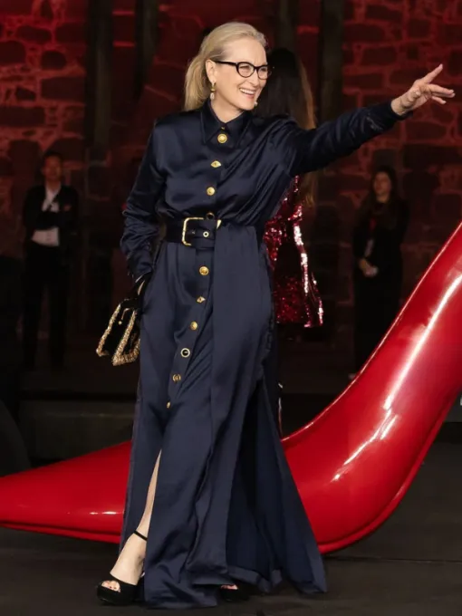 Meryl Streep The Devil Wears Prada 2 2026 Long Maxi Shirt-Coat: Midnight Navy Elegance with Gold Accents