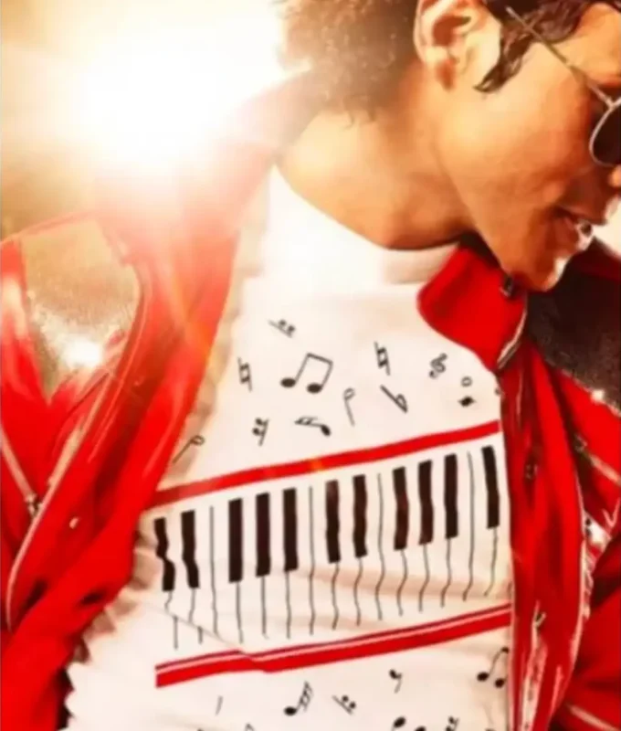 This look recreates the electrifying “Beat It” era from the early 1980s with remarkable precision. The piano key shirt features musical notes, symbolizing Michael’s deep connection to rhythm and performance. Jaafar pairs the shirt with the iconic red leather jacket and aviator sunglasses for a complete transformation. This outfit captures Michael’s rebellious energy and bold street-inspired fashion during the Thriller era.