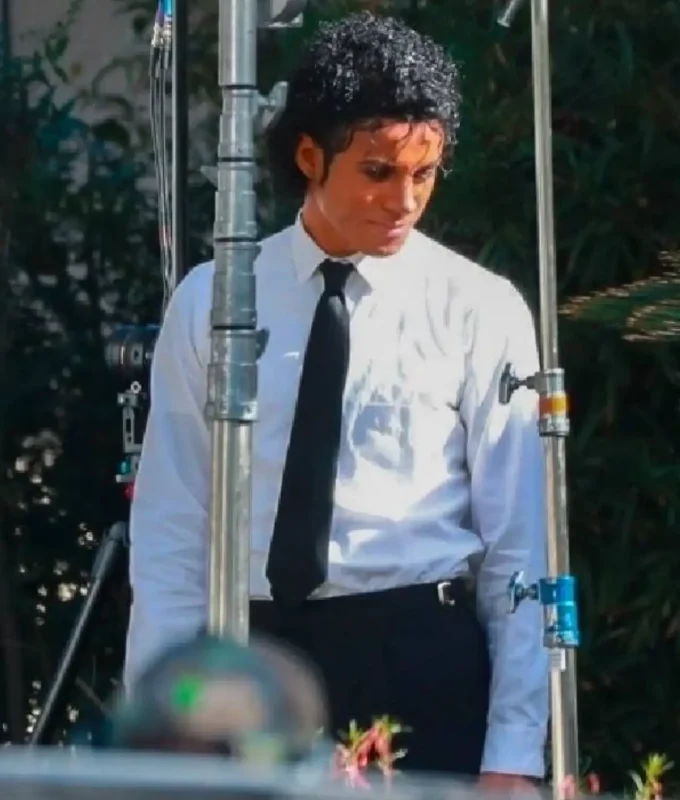 Jaafar Jackson perfectly captures the late 1980s “Man in the Mirror” era with refined sophistication. He wears a crisp white dress shirt paired with a slim black tie and tailored trousers. The signature wet-look Jheri curl hairstyle enhances authenticity and reflects Michael’s evolving image. This outfit highlights Michael’s transition into a more polished and professional aesthetic during the Bad era.