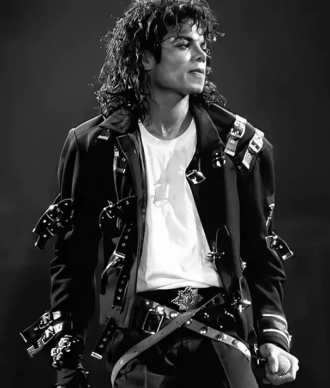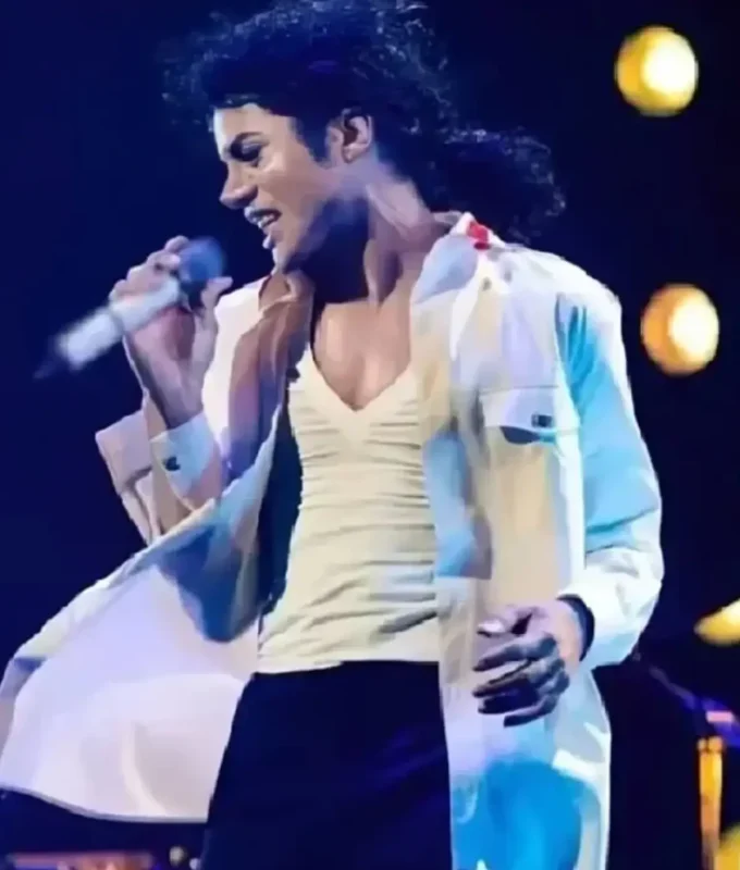 This white bolero-style jacket reflects Michael’s dance-focused performance outfits. Crystal embellishments add elegance and refined sparkle to the design. The cropped silhouette allows freedom of movement during choreography. This piece perfectly captures the balance between style and performance functionality.