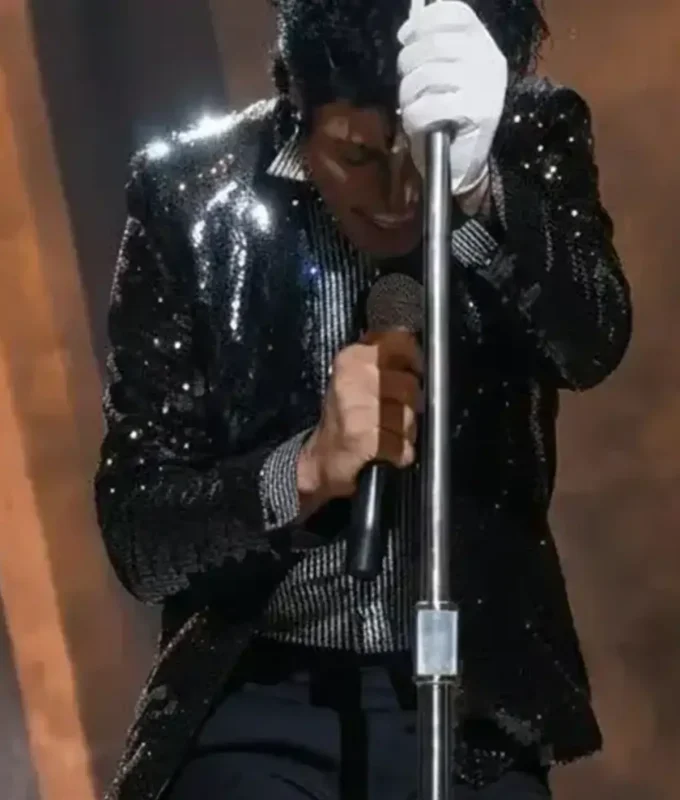 This jacket recreates the legendary “Billie Jean” performance look with remarkable detail. The black sequin finish shimmers under lights, creating a mesmerizing stage effect. A silver armband adds the signature touch that defines this iconic outfit. This piece represents one of the most unforgettable moments in Michael’s performance history.