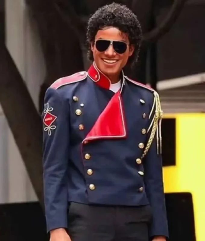 This royal blue hussar jacket channels Michael Jackson’s iconic military-inspired stage costumes. Gold frogging and decorative elements add regal authority and dramatic visual impact. The structured design enhances Jaafar’s posture, creating a powerful and commanding presence. This piece reflects Michael’s fascination with ceremonial fashion and performance symbolism.