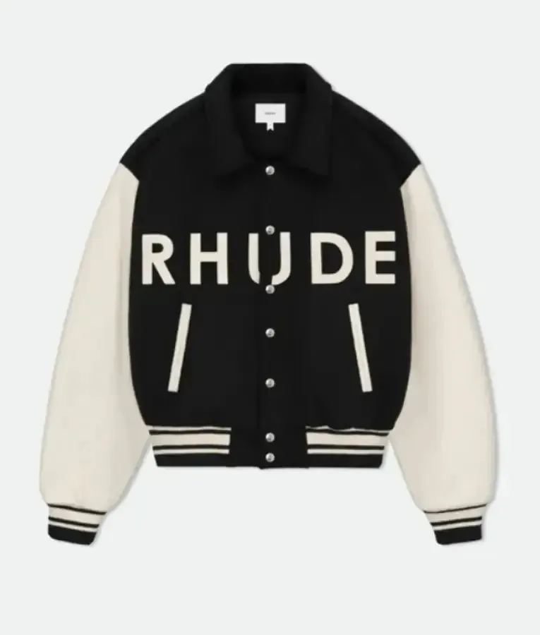 The jacket features a sleek black body paired with off-white sleeves. Consequently, this combination creates a clean yet visually striking appearance. Additionally, the contrasting tones enhance versatility for various outfit pairings. The jacket displays the bold “RHUDE” logo across the chest. Moreover, designers use large cream lettering for strong visual impact. Interestingly, the button placket interrupts the logo for a structured effect. As a result, the branding looks both modern and thoughtfully integrated. The jacket includes a full-length silver snap-button front closure. Furthermore, the closure provides convenience and a secure fit. Instead of ribbed collars, the jacket features a flat spread collar. Therefore, the collar delivers a more polished and refined appearance. The jacket includes two front angled welt pockets for functionality. Additionally, cream piping highlights the pocket design with subtle contrast. As a result, the pockets offer both practicality and visual harmony. The cuffs feature black-and-white striped ribbed knit detailing. Similarly, the hem includes matching striped ribbed finishes. Consequently, these trims preserve the authentic varsity jacket aesthetic.