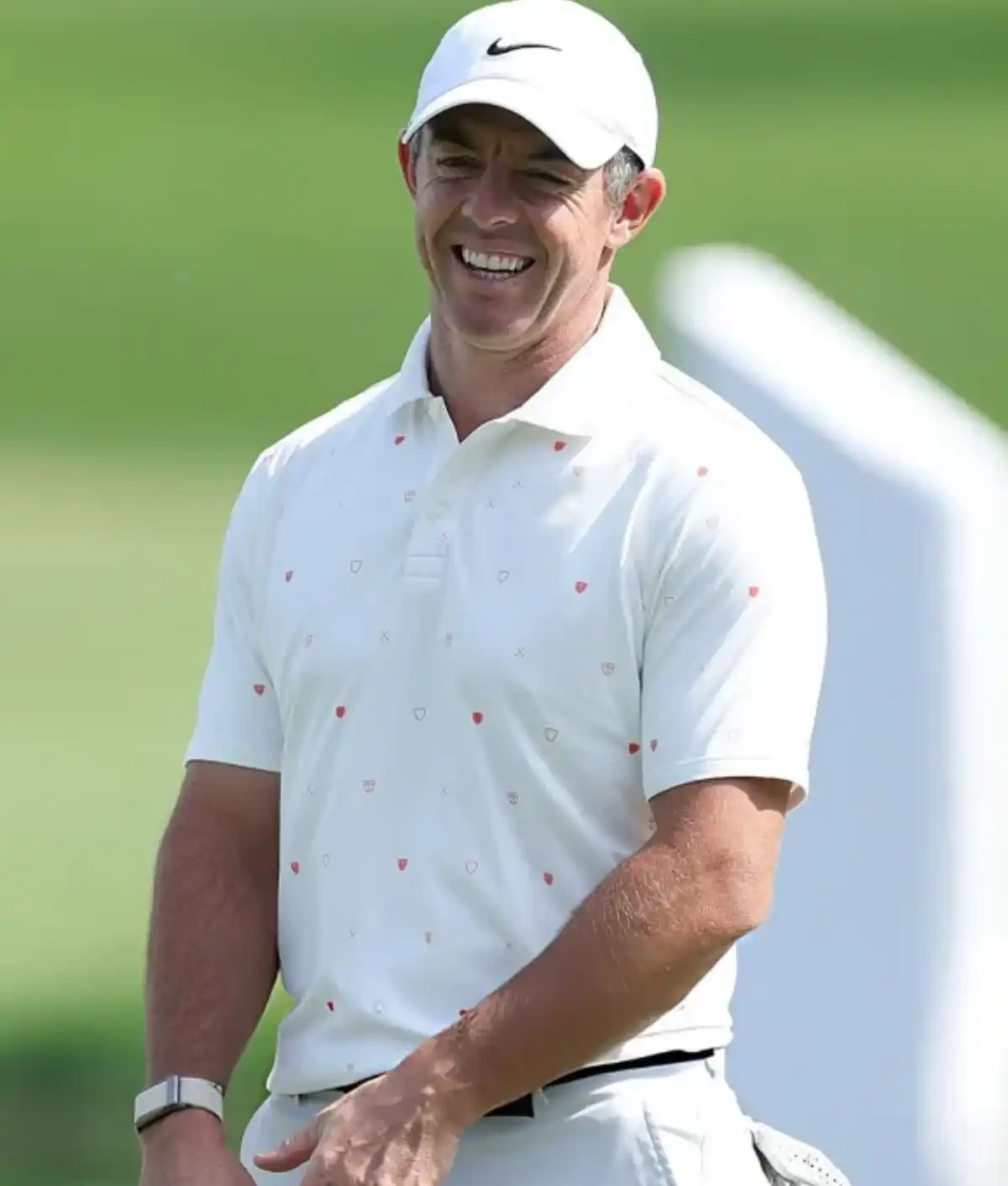 Spectators noticed refined look when Rory McIlroy competed. He wore a pristine white performance polo. He competed at the Hero Dubai Desert Classic. Organizers hosted it at Emirates Golf Club. The polo used a bright white base. Designers added a delicate repeating heart-inspired fabric pattern. Small red motifs included hearts, miniature shields, and crosses. They distributed motifs evenly, adding interest without overwhelming cleanliness. A black Nike swoosh sat on left chest. A circular logo patch accented the left sleeve. The shirt kept a flat-knit collar and three-button placket. He finished with a coordinated white Nike baseball cap. The cap showed black logo, reinforcing cohesive professional appearance. Overall, the ensemble conveyed assurance and composure. Subtle hearts added charm; sharp tailoring preserved sleek competitiveness. Matching monochrome accessories kept the look tournament-appropriate. Under strong Middle Eastern sun, crisp white projected freshness, clarity. These traits matched McIlroy’s precision and control reputation on course.