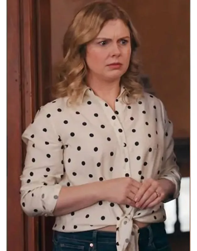 Rose McIver wears a polka dot shirt blending charm and chic. The blouse shows a creamy off-white base with black polka dots. Classic black dots give the shirt a timeless, elegant appeal. Long sleeves and a structured collar balance sophistication and flair. The tie-front hem knots at the waist, creating a cropped silhouette. This relaxed fit subtly accentuates her figure on-screen and off. Gathered cuffs provide comfort while maintaining a stylish sleeve shape. The design suits both on-screen elegance and real-life wear.