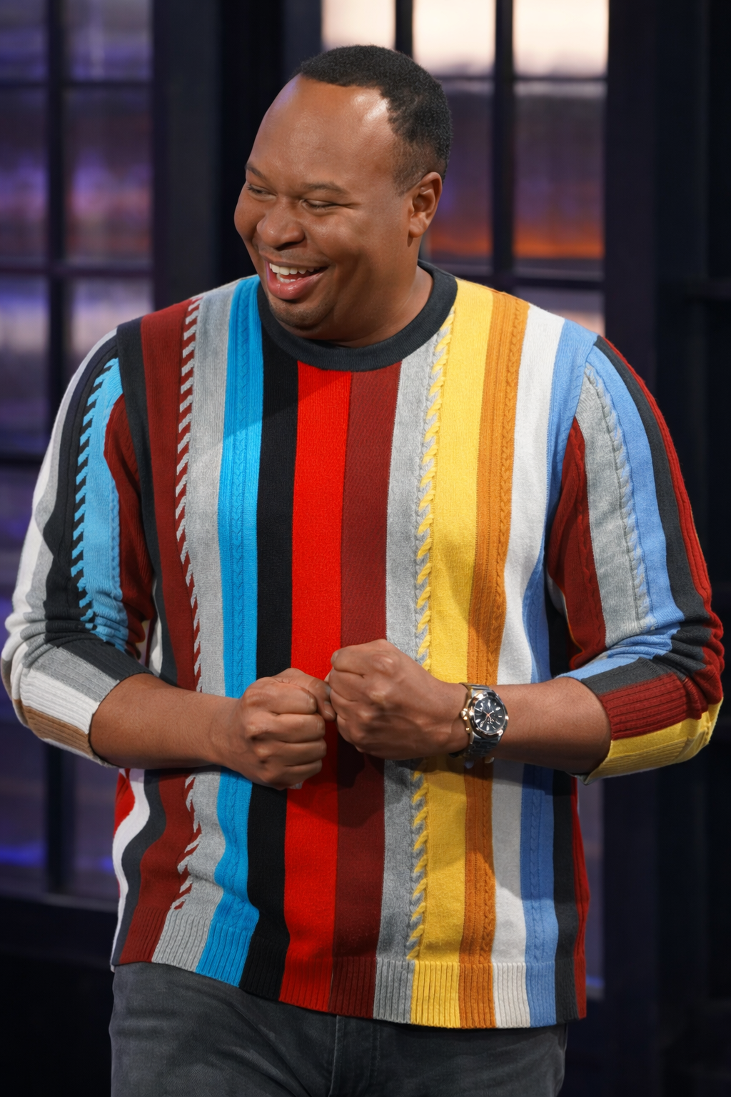 Roy Wood Jr. charmed audiences on The Kelly Clarkson Show. He wore a multicolored crewneck stripe sweater that stunned viewers. The sweater blended playful creativity with modern, stylish design. It reflected his bold personality perfectly and caught attention.