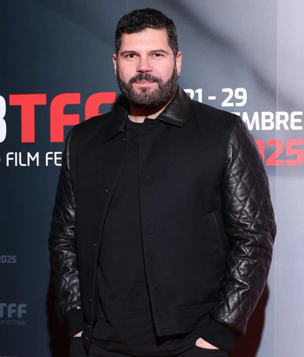 Salvatore Esposito jacket, Torino Film Festival 2025 jacket, black varsity jacket, quilted leather sleeve jacket, celebrity style jacket, minimalist varsity jacket, luxury streetwear jacket