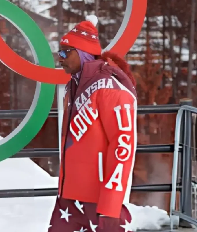 Snoop Dogg showcased his most talked-about outerwear piece. Moreover, he honored Team USA bobsledder Kaysha Love with this design. First, the design features large high-resolution portraits of Kaysha Love on the front and back. Next, bold “LOVE” typography runs diagonally across the front. Additionally, the sleeve displays “USA” printed vertically. Moreover, white five-point stars stretch across the burgundy shoulders. Furthermore, the design incorporates asymmetrical orange, red, and burgundy color-blocking. In terms of construction, the exterior uses high-quality parachute fabric. Meanwhile, heavy insulation creates a structured puffer silhouette. Inside, the jacket features a soft viscose inner lining. For added warmth, the design includes a stand-up collar. The front also features a secure zipper closure. At the wrists, elasticized cuffs effectively seal in heat. For storage, the jacket provides two exterior slant pockets. In addition, the interior includes two secure pockets. Finally, this piece belonged to his “Coach Snoop” athlete tribute series. Specifically, the series showcased American winter athletes as wearable art.