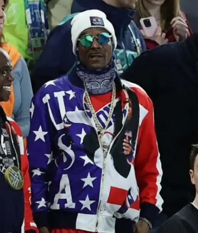 Snoop’s first major Olympic appearance was as Team USA’s honorary coach. He wore a custom multicolor zipper hoodie featuring American flag motifs. Designed for both warmth and style, the hoodie combines navy, red, and white in a mix of bold color blocks and intricate patterns.