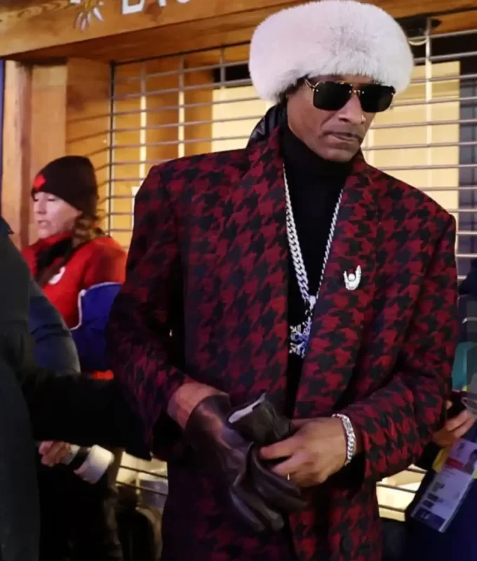 For a sophisticated alpine look, Snoop abandoned his usual athletic gear. First, the coat's design displays a striking red and black houndstooth pattern. Next, it features a structured, tailored longline silhouette. Additionally, the formal lapel collar enhances its refined elegance. Moreover, the coat secures with a buttoned front closure. Construction: Furthermore, craftsmen used premium wool fabric for durability and warmth. Also, they lined it with soft viscose for extra comfort. It offers two outer pockets and two interior pockets for storage. Importantly, the sleeves finish cleanly without ribbed cuffs. Ultimately, this coat stands as a refined statement piece on snowy Milan streets