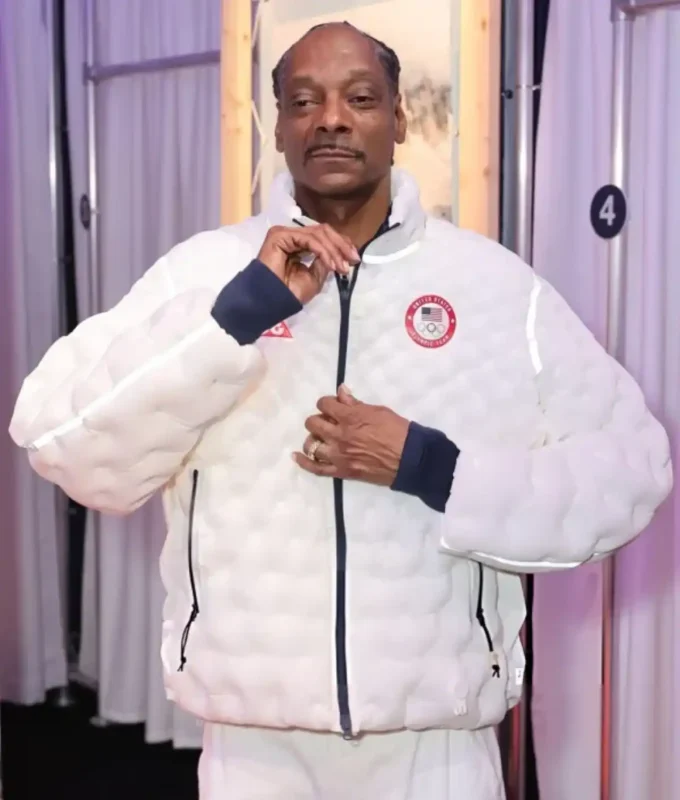 For his NBC correspondent duties and coaching appearances, Snoop donned a white, quilted Team USA jacket. This jacket merges athletic precision with high-fashion aesthetics, ideal for both coverage and off-duty style.