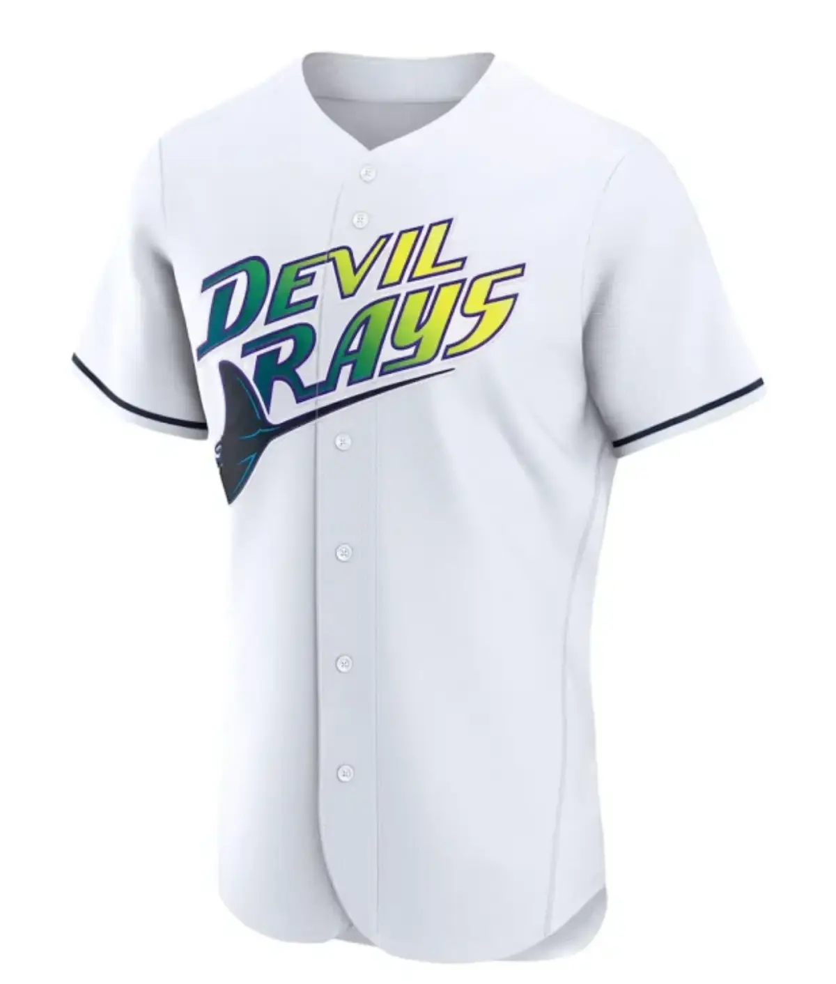 The white jersey highlights the eye-catching “DEVIL RAYS” wordmark at the chest. Its italicized font transitions from deep teal and purple to lime and yellow. Thus, the lettering creates a lively and dynamic visual effect. Below the wordmark, a sleek manta ray graphic extends gracefully across the chest. Its tail curves under “RAYS” to honor the original mascot. Additionally, it adds a sense of movement to the overall design.