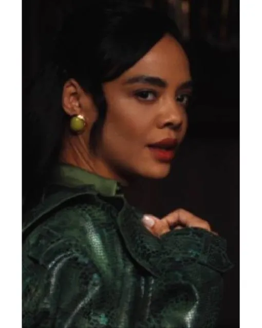 Tessa Thompson commands the Screen in a luxe green snakeskin trench on His & Hers