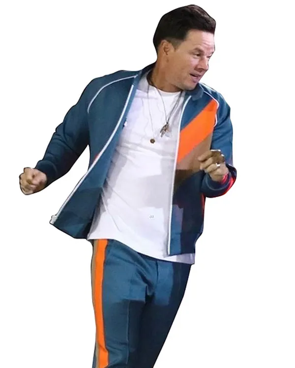 Me Time 2022 Mark Wahlberg Diagonal Orange Tan Stripe Blue Tracksuit