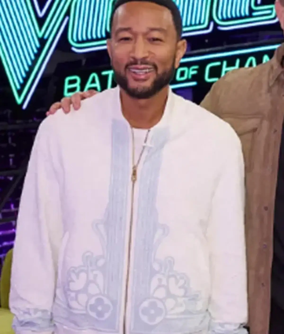 John Legend Print Gold Zipper White Zip Cardigan from The Voice Season 29. Next, explore its luxury design, Louis Vuitton inspiration, and rising celebrity fashion popularity. Moreover, the The Voice S29 John Legend Print Zip Cardigan reflects John Legend’s refined style. Additionally, John Legend wore this cardigan during The Voice Season 29, “Battle of Champions.” Consequently, viewers and fashion enthusiasts quickly noticed the stylish statement piece. Meanwhile, the season features returning contestants competing in a unique four-round format. Just Like Andrea Menard Outfits. Furthermore, Legend’s wardrobe again proves his reputation for elegant, statement-making looks.