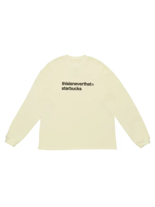 This T-shirt perfectly captures the “less is more” idea with effortless style. Moreover, it blends modern streetwear with café culture in a natural, easy-to-wear way. The off-white cream base gives the T-shirt a refined and versatile look. On the front, it features a centered graphic with the thisisneverthat® logo above Starbucks branding. Both elements use bold, lowercase sans-serif typography to create a clean, contemporary identity. Additionally, the color contrast enhances the overall appeal without overwhelming the design. The print appears in black or deep forest green, standing out against the soft base tone.