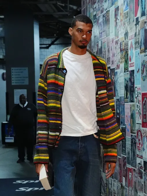 For bold sport and high-fashion fusion, Victor Wembanyama wears Spurs Vs Trail multicolor jacket. He arrives at Moda Center Arena in Portland for Round One Game Three 2026 NBA Playoffs. Consequently, the oversized artistic design instantly captures attention among fans and media. Moreover, designers craft a vibrant wool cardigan jacket with thick ribbed stitching throughout, just like his beige quarter-zip jacket. Additionally, relaxed silhouette features drop shoulders and wide sleeves for effortless stadium entry style. Meanwhile, earthy tones include charcoal gray, olive green, and mustard yellow across base layers. Furthermore, bold accents add royal blue, bright orange, white, and violet in stripes. These horizontal stripes vary width creating dynamic rhythmic intentionally unbalanced visual pattern overall. In addition, simple button-down front anchors design featuring contrasting blue top button. Finally, low-profile collarless crew neck keeps clean neckline highlighting inner white base layer. Meanwhile, striped cuffs and hem maintain continuity ending with weighted balanced slouch structure.