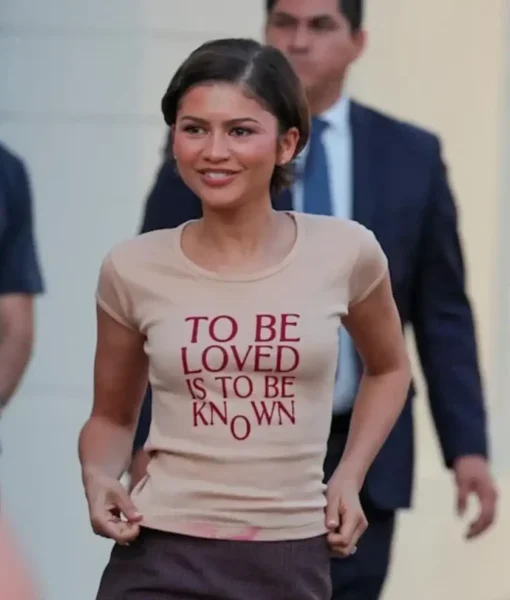 This graphic baby tee stands out as both wearable merch and a fashion statement, making it perfect for those who love expressive yet minimal style, just like her Rome 2026 oversized black blazer. You can shop the Zendaya To Be Loved Is To Be Known beige t-shirt from The Celeb Jackets, where premium celebrity-inspired fashion is recreated with attention to detail and comfort.